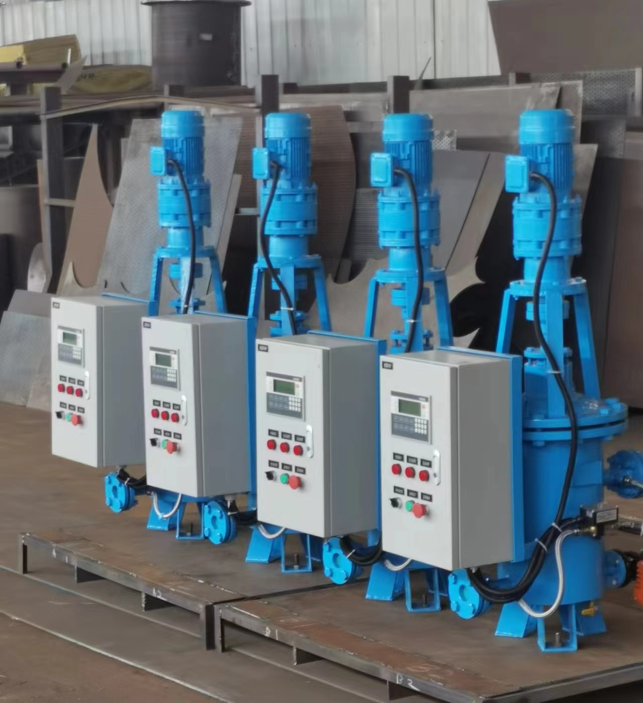 如用户选型为电动滤水器,则当杂质聚积到一定数量时,利用冷却水进出水管之间差压信号来开启电动排污阀,对附着在网芯内侧壁面上的杂质污物反向冲洗,经由排污斗、排污管路和排污阀门排入冷却水出水管中。排污斗步一进旋转,依次对准球面网芯每一分格壁面,进行反冲洗。